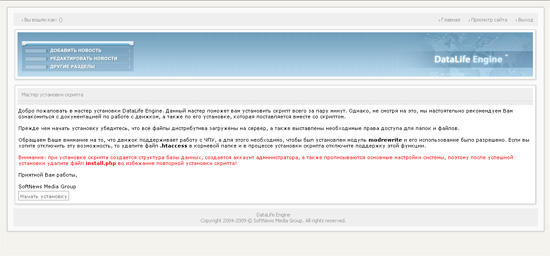 Запускаем http://dle.ru/install.php и видим страницу с приветствием от разработчиков: