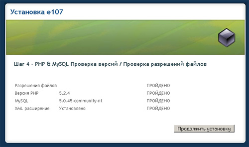 На этом шаге выполняется проверка версии системы и необходимых настроек сервера для дальнейшей работы. Если всё нормально, то нажимаете "Продолжить установку".