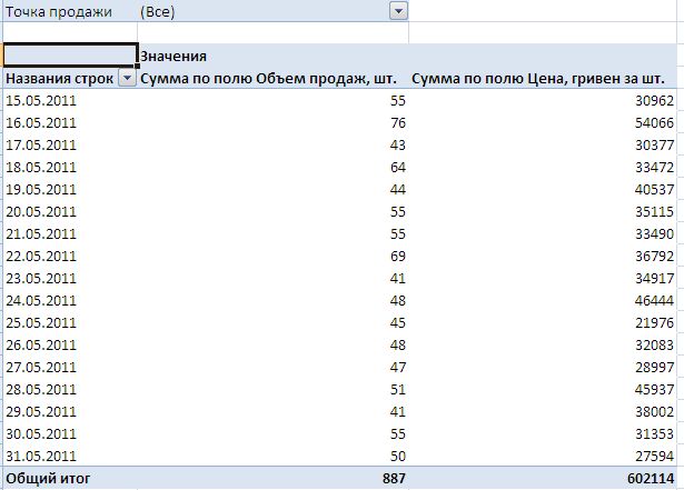 Для нашего примера попробуем создать таблицу, которая будет суммировать данные Объем продаж, шт. и Сумма выручки для каждого значения в столбце Дата и для каждой Точки продажи. Для этого нужно выполнить следующие действия: