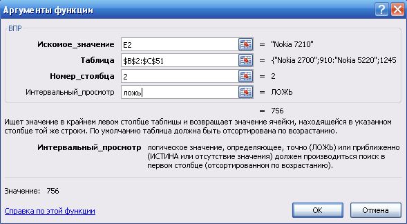 В диалоговом окне Аргументы функции указываем следующие значения: